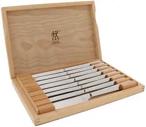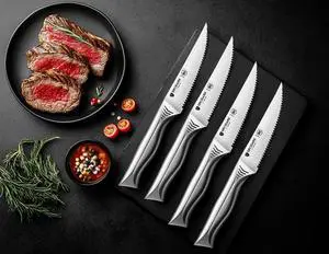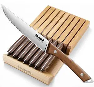 - Features: 8" Chef knife, 6 Pcs 4.5" serrated steak knife, 8" Slicing knife, 7" Santoku knife, 8" Serrated bread knife, Dishwasher Safe, Hand Wash
