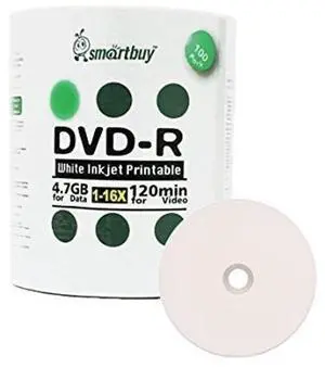 Smart Buy 100 Pack DVD-R 4.7gb 16x White Printable Inkjet Blank Media Record Disc, 100 Disc 100pk