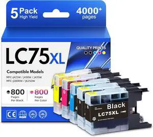 Laser Tek Services® Black and Color Brother LC-75BK LC-75C LC-75M LC-75Y (1BK, 1C, 1M, 1Y)Cartridge Quantity: Four PackCompatible Products: Works with: Brother MFC-J280W, MFC-J425W, MFC-J430W, MFC-J435W, MFC-J5910DW, MFC-J625DW, MFC-J6710DW, MFC-J6910DW, MFC-J825DW, MFC-J835DW,Approximate Page Yield: 600 pages for black & 600 pages for color cartridgesCoverage: 5%Model #: Bro_LC75_4PK