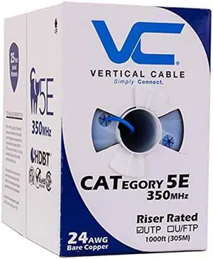 Vertical Cable Cat5e, 350 Mhz, Overall Shielded, UV Jacket, Outdoor, CMX, Messenger, 1000ft, Black, Bulk Ethernet Cable, Wooden Spool