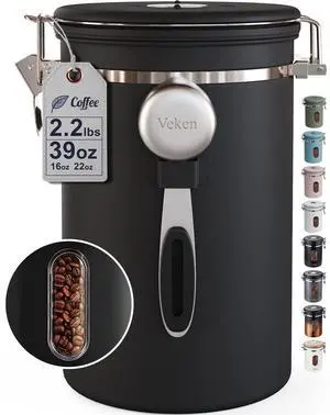 Large Coffee Canister with Window, Kitchen Food Storage Airtight Stainless Steel Container for 2.2lbs Coffee Beans, Grounds, Rice,Tea, Flour, Cereal, Sugar Jars,Date Tracker and Scoop 39oz,Black