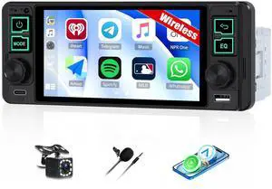 Single Din Touchscreen Car Stereo with Wireless Carplay&Android Auto,5.1" Car Radio MP5 Player with Bluetooth FM Radio EQ Car Audio with USB/Type-C SWC+Backup Camera
