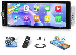 Single Din Touchscreen Car Stereo with Wireless Carplay&Android Auto,6.9 Inch Car Radio MP5 Player with Bluetooth FM Radio EQ Car Audio with USB/Type-C SWC+Backup Camera+Microphone