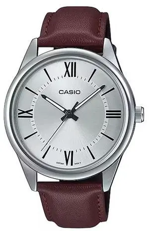 Casio Mens Silver Dial Brown Leather Strap Watch - CasioMTPV005L7B5UDF
