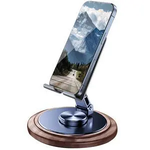 Adjustable Cell Phone Stand,360 Rotating Foldable Desktop Cellphone Stand with Anti-Slip Base Portable Phone Holder for iPhone 16 15 14 13 Pro Max, All Smart Phones, iPad (Wood)