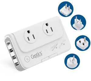 Ceptics Travel Power Strip - Small & Compact - Surge Protector - Grounded USB + Type C - 2 USA Outlets Input - Plugs for Europe, Asia, China, USA, South America
