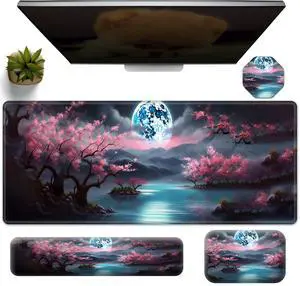 Large Gaming Mouse Pad+Memory Foam Ergonomic Keyboard Wrist Rest Support+Wrist Rest+Coaster, Extended Desk Pad Set, Stitched Edge Non Slip Desk Mat 4PC for Office & Home, Moon Cherry Blossom