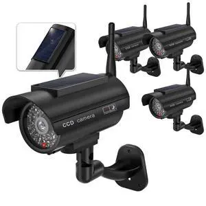 WALI Dummy Fake Camera, Solar Powered Fake Security Camera with LED Light, Simulated Surveillance Security CCTV Dome Cameras with Antenna and Warning Sticker Indoor Outdoor (SOL-TCB4), 4 Packs, Black