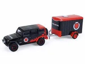 2012 Jeep Wrangler Unlimited "Diablo Sport" Black with Red Graphics & Small Cargo Trailer 1/64 Diecast Model Cars by Greenlight