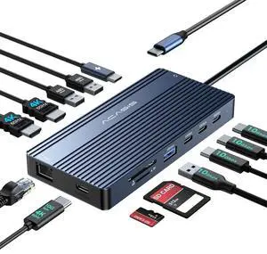 Features: - Three HDMI ports support video output simultaneously: one HDMI port can support the resolution up to 4K@60Hz and the other two support up to 2K@60Hz. - Extend/Mirror video modes are available for multiple tasks. - 130W Power Supply delivers maximum 100W power upstream to charge your laptop. - A...