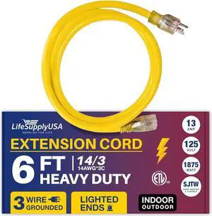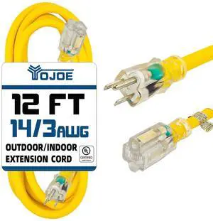 Features: This 12 Foot power extension cord is made by yojoe and features a 14/3 style with copper material. It supports a voltage of 125 volts and an input current of . The cable is Yellow in color and is UL listed. It comes with a Male-to-Female connector and does not require batteries.