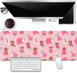 Cute Dogs Desk Pad Mouse Pad,Large XL Pink Mouse Mat with Stitched Edges for Women Girl,Non-Slip Rubber Base Mousepad for Office PC Keyboard Laptop and Home Work Desk Mat(31.5X11.8 in)