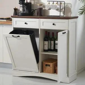 13 Gallons Tilt Out Trash Can Cabinet Freestanding Kitchen Trash Can Hidden Garbage Recycling Cabinet with Hideaway Drawers Pet Proof Trash Can Holder for Kitchen Living Room, Antique White