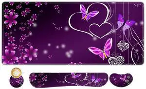 Large Gaming Mouse Pad, Keyboard Wrist Rest Pad & Wrist Support Mousepad Set, Stitched Edge, Extended, Non-Slip Base, Memory Foam Desk Mat for Office, Home, Purple Heart Butterfly