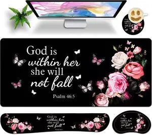 Large Gaming Mouse Pad Set 35.4 x 15.7 with Keyboard Wrist Rest, Wrist Support, and Coaster Memory Foam Smooth Desk Pad Mousepad for Home Office School - Floral Bible