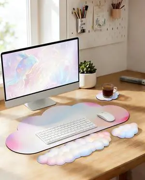 Large Cloud Mouse Pad Waterproof with Cloud Keyboard Wrist Pad and Cloud Mouse Wrist Pad Set, Ergonomic Computer Desk Wrist Support Mousepad for Keyboard and Mouse 35.4x15.7in Rainbow