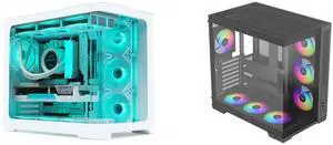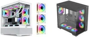 SAMA 2851 ATX Mid-Tower PC Gaming Case, High-Airflow, Sturdy Curved Tempered Glass Front, 4 ARGB PWM Fan Pre-installed with Fan Hub, White and SAMA V52 ATX Mid Tower PC Case, Dual-Chamber Panoramic Tempered Glass Gaming Case, Back-Connect ATX Support, Type-C USB 3.2, Supports 420mm GPU & 360mm Radiator, 7 ARGB PWM Fans Included, Black