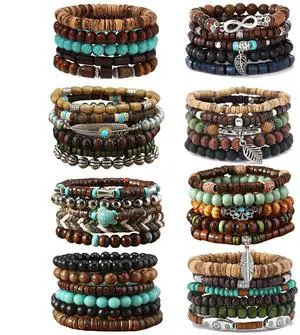 43Pcs Punk Wooden Beads Bracelets Gothic Bracelet for Men Adjustable Vintage Beaded Bracelet Metal Set Wood Bangles Wristbands Commemorative Gift