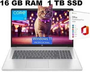 HP 17 Laptop, 17.3" HD+ (1600 x 900) Display, Intel Core i3-N305 8 Cores Processor, Intel UHD Graphics, Wi-Fi 6, 16GB DDR4 1 TB PCIe SSD, Windows 11 Pro, Office 2024 License