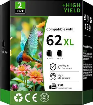 62XL Ink Cartridges (2 Black) Replacement for HP Ink 62 for HP 62XL Black Ink Cartridge Works with Envy 5540 5544 5545 5642 5660 5664 7640 7645 OfficeJet 200 250 258 5740 5745 5746 Series | C2P05AN