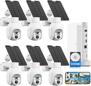 2K Solar Powered Security Cameras Wireless Outdoor, No Subscription, 6-Cam Pack, Home Security Camera System, 360° Pan & Tilt, Color Night Vision, 5G & 2.4G WiFi, 500GB HDD 10CH NVR, Motion Detection