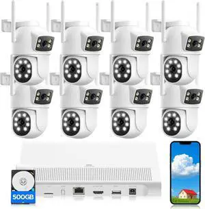 8pcs 2K Dual Lens Security Cameras Wireless Outdoor, 5G & 2.4G WiFi Home Security Camera System with Color Night Vision, Auto Tracking, 2-Way Audio, 360° Pan & Tilt, 500GB HDD 10CH NVR No Subscription