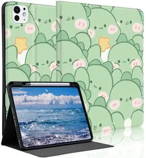 Idocolors Cute Green Dinosaur Case for 13" iPad Air M3 2025/M2 2024 with Pencil Holder, Auto Wake/Sleep Leather Soft TPU Back Cover for Women Girls