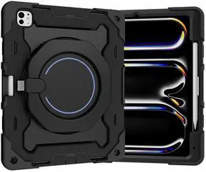 nincyee Tablet Silicone Case for iPad Pro 13" 2024, Shockproof Case with Pencil Holder, Shoulder Strap, Rotating Large Ring Hanging Kickstand for Kids