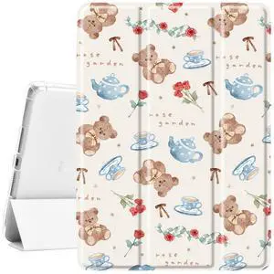 Idocolors Cute Kawaii Rose Teddy Bear Pad Case for 13 Inch iPad Pro(2024), Clear TPU Smart Stand Back Cover with Pencil Holder, Auto Wake/Sleep Foldable Shockproof Protective Case for Women Girls