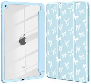 Idocolors Cute White Bow Case for iPad 7th/8th/9th Generation 10.2 inch, Clear Hard Back Cover with Pencil Holder, Tri-fold Stand Full Wrap Protective Case for Women Girls, White Bow/Blue Case
