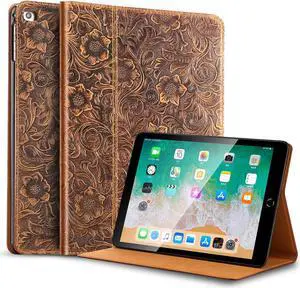 Gexmil for iPad 9.7 Inch Case,6th/5th Generation(2018/2017)-iPad Air 2/1 Gen. Genuine Leather Cover Auto Sleep/Wake,Cowhide Folio Cover with Adjustable Stand with Buckle,Anti Slip,Flower Brown