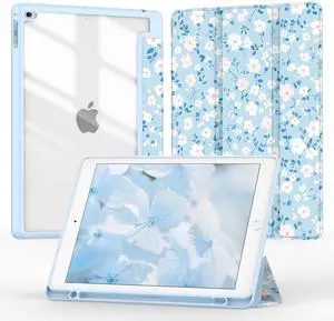 Jarviwiin Case for iPad 6th/5th Generation 2018/2017, for iPad Air 2/Air 1(9.7 inch),Tri-Fold Auto Wake/Sleep 9.7'' Cover with Clear Back/Pencil Holder for iPad 6 5 Gen(Floral Blue)