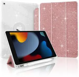 TopPerfekt Clear Case for iPad 9th / 8th / 7th Generation (2021/2020 / 2019) 10.2 Inch - Glitter Shiny Sparkly Cover with Transparent Back Shell, [Pencil Holder, Auto Sleep/Wake] Light Pink