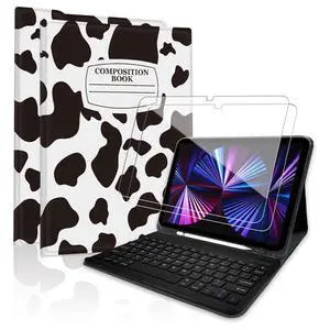 TopPerfekt for iPad Pro 11" 4th/3rd/2nd/1st Gen (2022/2021/2020/2018) Bluetooth Keyboard Case with Screen Protector 2 Pack 9H Hardness Tempered Glass, Detachable, with Pencil Holde-Notebook Cow Black