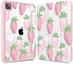 May Chen Case for iPad 12.9 Inch M2 (6th/5th/4th/3rd Generation, 2022/2021/2020/2018), [Penceil Holder] Trifold Stand Auto Wake/Sleep Clear TPU Protection Back Cover, Strawberries