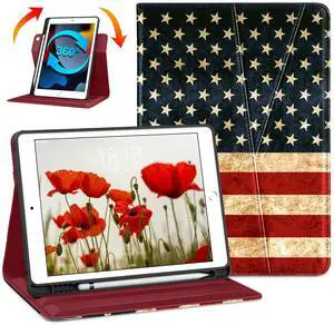 DTTO Rotating Case for iPad 9th/8th/7th Generation 10.2 Inch 2021/2020/2019, 360 Degree Swiveling Premium Leather Folio Stand Cover with Pencil Holder - Auto Wake/Sleep and Hand Strap, US Flag