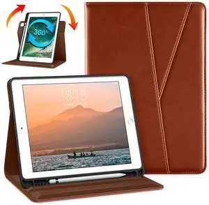 DTTO Rotating Case for iPad 6th / 5th Generation 9.7 Inch 2018/2017, iPad Air 2 / Air 1 Case, 360 Degree Swiveling Premium Leather Folio Stand Cover with Pencil Holder - Auto Wake/Sleep, Brown