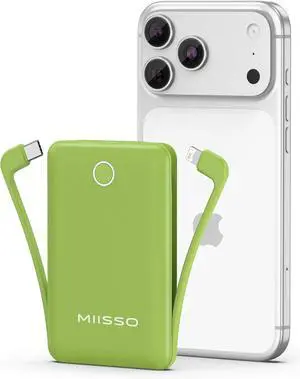 10000mAh Mini Portable Charger with Built in Cable Pocket Size Power Bank Travel External Battery Pack for Phone 3 Output USB Type C Cord Clutch Compatible with iPhone Green