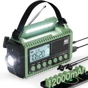 Emergency Weather Radio, Hand Crank 12000mAh Battery Powered Auto Alert NOAA Radio,130H Runtime, LCD Digital Display, SOS, Flashlight,Phone Charger, Solar Portable AM/FM/SW Radio for Emergency/Outdoor