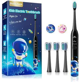Kids Electric Toothbrush Rechargeable Age 3-5-6-12-18 Year Old, Sonic Toothbrush Kids with Timer 3 Modes 4 Vibrating Heads Habit Stickers Tooth Brush for Girls Boys and Childrens (Astronaut Black)