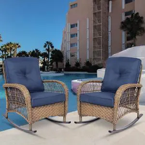 MEETWARM Outdoor Wicker Patio Rocking Chair Cushioned Rattan Rocker Chair for Porch, Deck, Poolside with Steel Frame, Weather-Resistant Navy Blue Cushions, Set of 2
