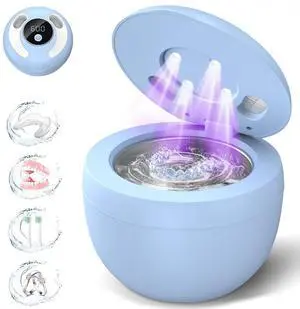 Dental Ultrasonic Retainer Cleaner Machine: 45kHz Dental Cleaning Pod for Denture, Mouth Guard, Night Guard, Aligner, Braces, Toothbrush Head & Jewelry, UV Cleaner with Digital Timer & 4 Modes, Blue