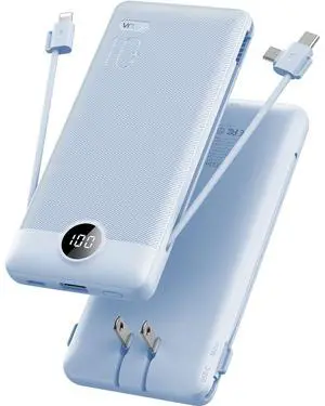 JAYSUING Portable Charger Built-in Cables and AC Wall Plug, USB C Power Bank 10000mAh, Travel Essentials Phone Charger Compact Lightweight External Battery Pack for Smart Phones, Tablets etc-Blue