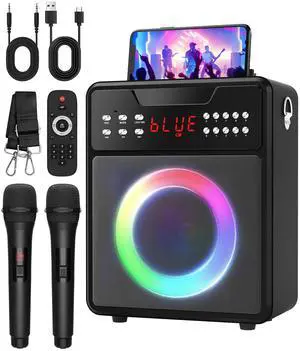 Karaoke Machine, Pro Karaoke Speaker with 2 Wireless Microphones, Portable Design 5.3 Bluetooth for Adults Kids Gifts with DJ Lights for Home Party, Outdoor Events, Supports FM/USB/AUX/REC/TF- Brand: HWWR