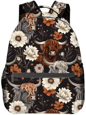 Rustic Highland Cow Backpack, School Travel Laptop Polyester Cows & Floral Backpacks for Women Kids, Work Sports Back Pack Casual Daypack, Lightweight Rucksack Gifts for Hiking Camping Gym
