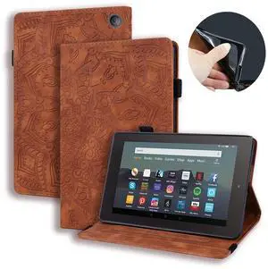 TUOLISG Case for Amazon Kindle Fire HD 10 9th/7th/5th Generation 10.1 Inch (2019/2017/2015) with Card Slots, Embossed PU Leather Shockproof Stand Case for Fire HD 10 9th/7th/5th Gen, Brown