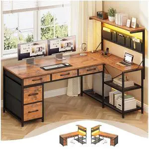 47" L Shaped Desk with 5 Drawers & Hutch, Reversible Gaming Desk with LED Lights & Outlets, Computer Desk with Open Shelves & Storage Bag for CPU, Books etc for Home Office, Space Saving, Rustic Brow