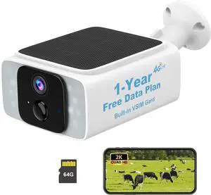 4G LTE Cellular Security Camera Outdoor System, Lifetime Free Unlimited Data,Wireless Solar Security Camera Built in SIM Card, 360° Live View, 2K Color Night Vision, PIR Motion Detection&Alert