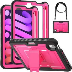 Miimall for iPad mini 7 Case with Stand, Shoulder Strap, Built-in Stylus Holder, Heavy Duty Shockproof Crossbody Case for iPad mini 7th/6th Generation 8.3", Hot Pink
