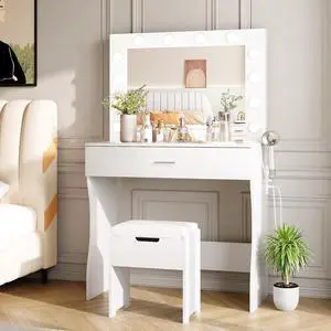 Vabches Makeup Vanity Desk with Mirror and 12 Lights 3 Color Modes, White Vanity Table for Bedroom with Charging Station, Vanity Set with Large Mirror and Storage Stool